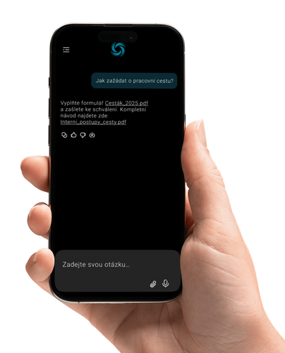 Díky vektorovému indexu dokáže efektivně pracovat i s velkými objemy dokumentů a nacházet odpovědi napříč celou firemní dokumentací.